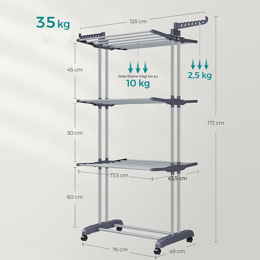 Nerezový ocelový rám a pevné plastové spoje zajišťují stabilní konstrukci s nosností 35 kg. Jednotlivé úrovně unesou až 10 kg, takže se můžete spolehnout, že vám sušák bude sloužit dlouhá léta.
