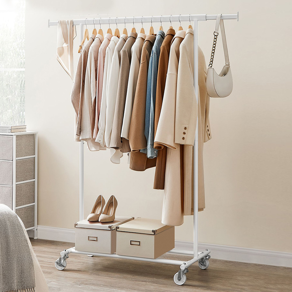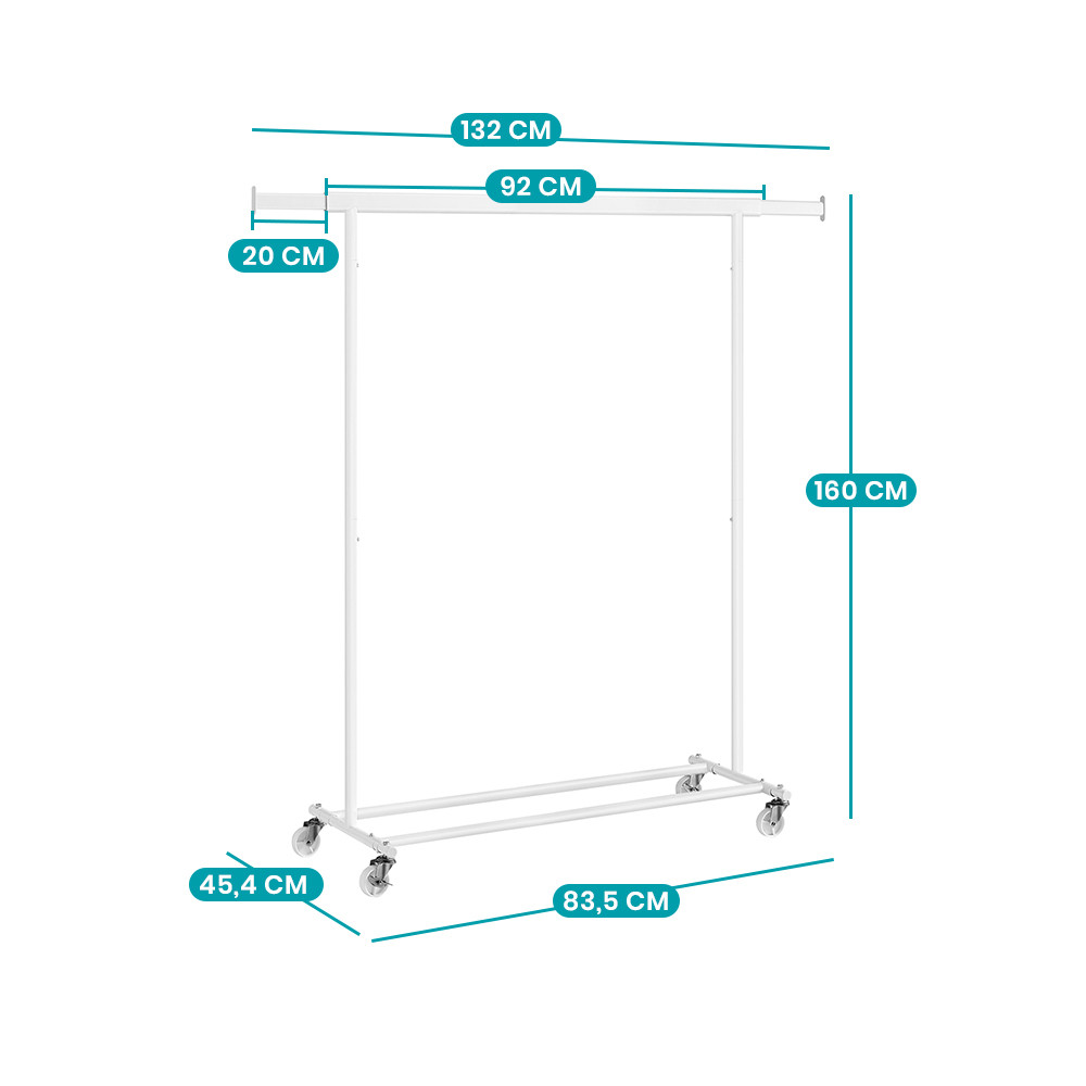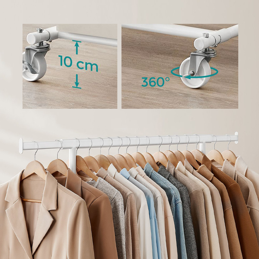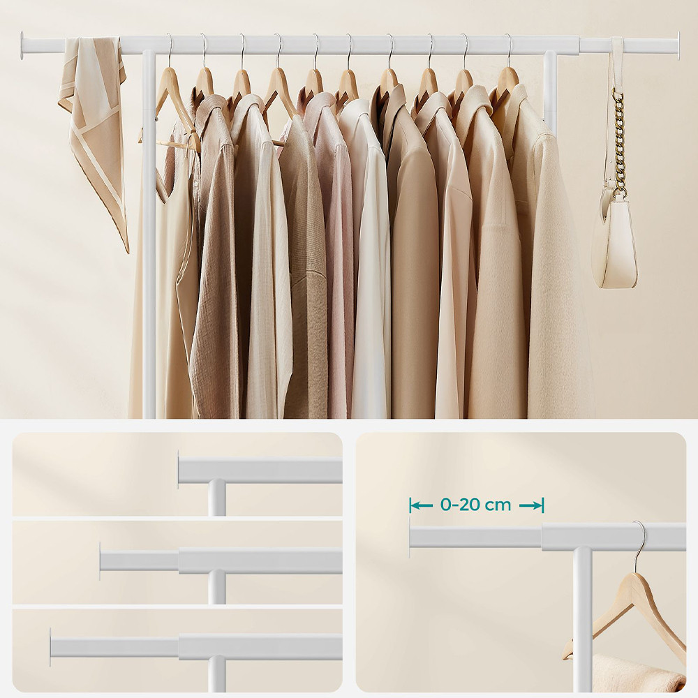 Horní tyč lze nastavit od 92 do 132 cm, což poskytuje dostatek prostoru pro různé druhy oblečení. Boční výsuvy jsou ideální pro tašky, šály nebo klobouky.
